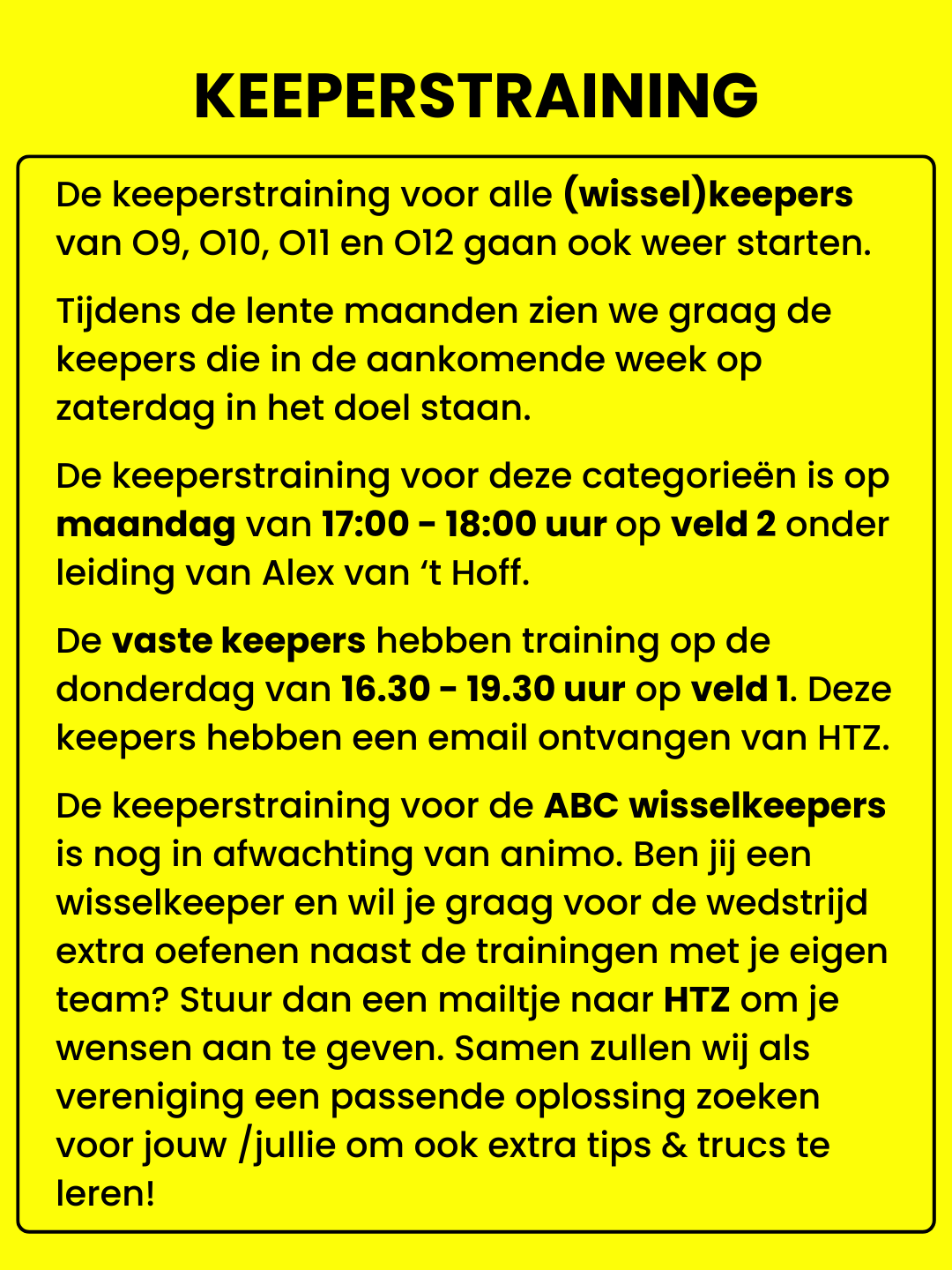 Sta jij komende zaterdag als wisselkeeper in het doel voor een jongste jeugd team O9, O10, O11 of O12? Kom dan op maandag naar de keeperstraining op veld 2.